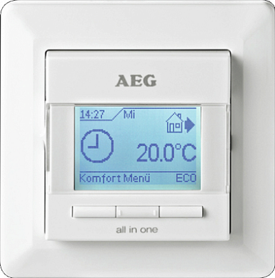 FRTD 903 Встраиваемый электронный терморегулятор с выносным датчиком температуры пола и встроенным датчиком температуры воздуха. Программируемый недельный таймер. Большой дисплей с