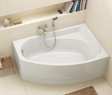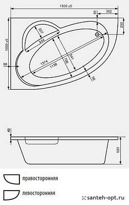 Асимметричная акриловая ванна Geneve, 150x100 см, правосторонняя белая. Глубина 52 см, объем 290 см.