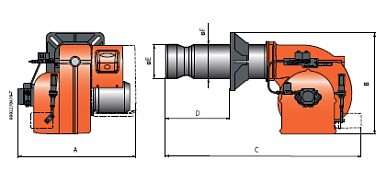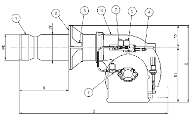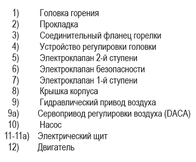 - горелка оснащена 4-штырьковым и 7-штырьковым разъемами, фланцем и изоляционной прокладкой для крепления к котлу, двумя шлангами и двумя форсунками.