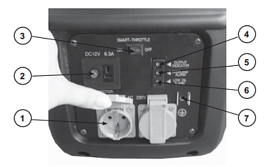 - Имеется индикатор перегрузки, который представляет собой диод красного цвета и загорается в случае короткого замыкания в электроприборе или в результате перегрузки генератора;