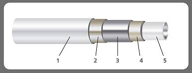Металлополимерные трубы CompipeТМ PEXb-AL-PEXb представляют собой пятислойную конструкцию: