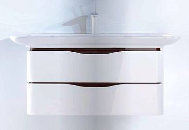 Подвесная тумба под раковину. Два выдвижных ящика. Ширина тумбы 800 мм. Поверхность корпуса: белая. Поверхность фасада: белая. Материал корпуса: ДСП. Поверхность ручки: белая. Материал фасада: ДСП.