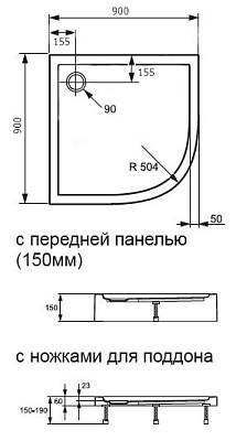 Глубина поддона - 23 мм. Ширина бортика поддона 1/4 круга - 55 мм. Диаметр сливного отверстия соответствует евро-стандарту для плоских поддонов (диаметр - 90 мм). Размеры поддона имеют стандартные допуски.