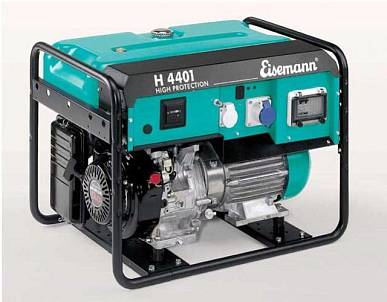 Eisemann H 4401 E имеет указатель уровня топлива в баке, воздушное охлаждение, 2 выходные защищенные розетки с заземлением на 16 А, 2-полюсный защитный автомат с тепловым и электромагнитным расцепителями, счетчик моточасов (не устанавливается совместно с UBC). Степень защиты IP 45. Продолжительность работы H 4401 E - на одной заправке с нагрузкой 3/4 от максимальной 12,5 ч. Оснащен электростартером.