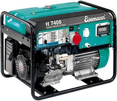 Eisemann H 7400 имеет указатель уровня топлива в баке, воздушное охлаждение, трехфазную розетку СЕЕ на 16 А, однофазную розетку СЕЕ на 16 А, однофазную розетку с заземлением на 16 А, 2-полюсный защитный автомат с тепловым и электромагнитным расцепителями, счетчик моточасов (не устанавливается совместно с UBC). Степень защиты IP 45. Продолжительность работы H 7400 на одной заправке с нагрузкой 3/4 от максимальной 8.5 ч.