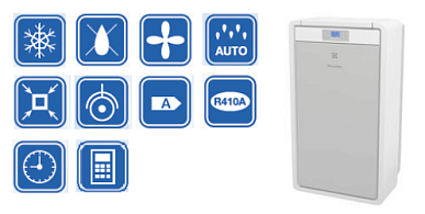 В конструкции предусмотрены также электронный термостат, трехскоростной вентилятор и таймер на включение/отключение. Кондиционер оборудован удобными роликами для перемещения. Поставляется в комплекте со шлангом выброса воздуха (длиной 1,3 м) и пультом ДУ.