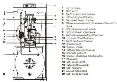Обеспечивает защиту системы от замораживания. В случаи падения температуры теплоносителя (котла) ниже 8°С автоматически включается горелка и циркуляционный насос (опция). Нагрев происходит до тех пор, пока температура теплоносителя не поднимется до 38°С.