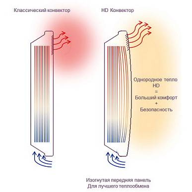 Применяемая уникальная технология EcoBoost позволяет снижать температуру при отсутствии людей в помещении (функция «Eco» - Экономия), а затем быстро повышать её при появлении людей в помещении (функция «Boost» - Ускорение), после чего конвектор быстро возвращается к заданной температуре. Оснащены закрытым нагревательным элементом (вольфрамовая нить в стальном корпусе) с насаженным на него алюминиевым диффузором (оребрение), который в 25 раз увеличивает площадь ТЭНа и, соответственно, площадь нагрева поступающего воздуха, а также понижает температуру ТЭНа не допуская его перегрева и перегорания, не пересушивает воздух и делает работу конвектора абсолютно бесшумной.
