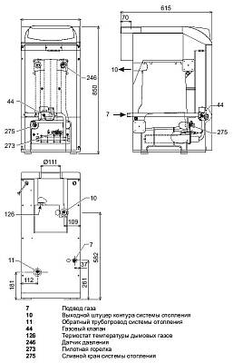 - чугунный теплообменник, изолированный слоем минеральной ваты, экранированной алюминиевый фольгой