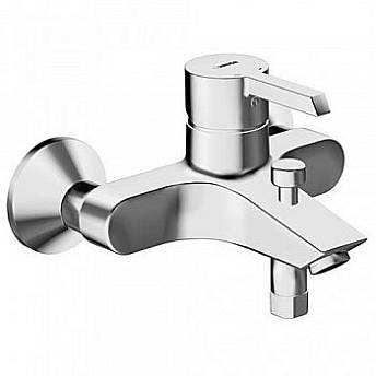 Однорычажный смеситель для ванны. Фиксированный излив. Монтируется на стену. На два отверстия. Наружная установка. Аэратор. Автоматический переключатель ванна/душ. Отвод для душа вниз G1/2. Эксцентричные соединения DN15 (G1/2). Защита от обратного потока для домашнего использования. Поверхность: хром.