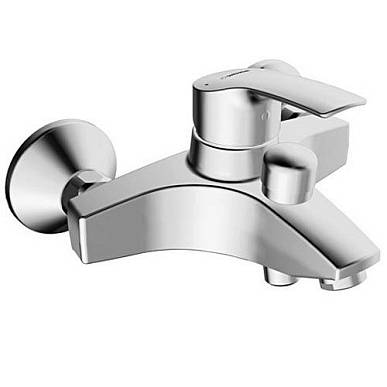 Однорычажный смеситель для ванны. Фиксированный излив. Монтируется на стену. На два отверстия. Наружная установка. Аэратор. Автоматический переключатель ванна/душ. Отвод для душа вниз G1/2. Эксцентричные соединения DN15 (G1/2). Защита от обратного потока для домашнего использования. Поверхность: хром.