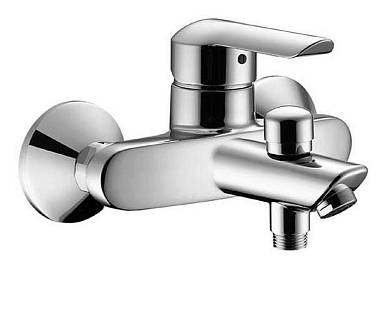 Однорычажный смеситель для ванны. Фиксированный излив. Монтируется на стену. На два отверстия. Наружная установка. Аэратор. Автоматический переключатель ванна/душ. Отвод для душа вниз G1/2. Эксцентричные соединения DN15 (G1/2). Защита от обратного потока для домашнего использования. Поверхность: хром.