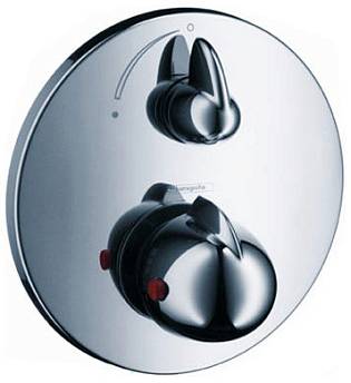 Термостатический смеситель для душа (внешняя часть) с запорным вентилем. Требуется скрытая часть. В набор входят: термоэлемент, рукоятка, гильза, розетка, керамический запорный вентиль. Монтируется на стену. На одно отверстие. Скрытая установка. Предустановленное ограничение температуры горячей воды, картридж МТС. Поверхность: хром.