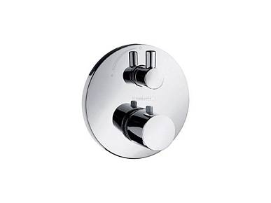 Термостатический смеситель для душа с запорным вентилем и цилиндрической рукояткой. Требуется скрытая часть. Монтируется на стену. На одно отверстие. Скрытая установка. В набор входят: рукоятка, гильза, розетка, керамический запорный вентиль, термоэлемент. Предустановленное ограничение температуры горячей воды. Картридж MTC. Поверхность: хром.