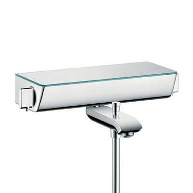 Термостат для ванны имеет предохранитель на 40 градусов С, запорный/переключающий вентиль на душ/ванну, защита от обратного тока воды, стеклянная полочка доступна в 2-х цветах, подключение ручного душа 1/2, эксцентрики с шумопоглащающим эффектом, улавливающий фильтр, штихмас 150 + _ 12 мм, расход воды 22 л/мин при 0,3 МРа.