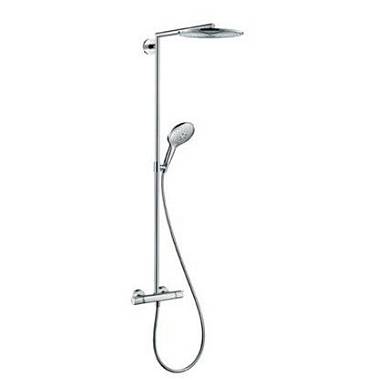 Душевая система Hansgrohe Raindance Select Showerpipe 300 27114000 (хром) верхний душ Raindance AIR Ø300 mm с технологией AIR и системой очистки от загрязнений QuickClean поворотный держатель 450 мм ручной душ Raindance Select 150 3jet ½’ (# 28587000) регулируемый по высоте держатель душа шланг Isiflex 1,60 m ½’ (# 28276000) термостат с предохранителем на 40°C запорным/переключающим вентилем на ручной и верхний душ монт...