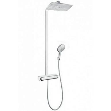 Душевая система с термостатическим смесителем. Механическое управление душем. В набор входят: верхний душ Raindance E AIR 1jet, держатель 380 мм, ручной душ Raindance Select 150 3jet, держатель Porter’S, шланг Isiflex 1,60 м. Термостат с предохранителем на 40ºC, запорный/переключающий вентиль на ручной и верхний душ. Поверхность: хром/белый.