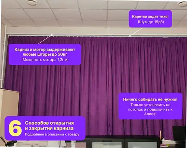 • Данный карниз прекрасно работает с Алисой, и управлять им вы можете целыми 6 способами!1) Сказать голосом "Алиса, открой шторы" в колонку или телефон (причем можно даже сказать "Открой на 50%" и она откроет наполовину!)