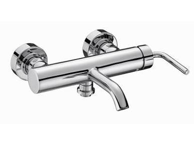 Однорычажный смеситель. На два отверстия. Монтируется на стену. Наружная установка. Фиксированный излив. Поверхность: хром.