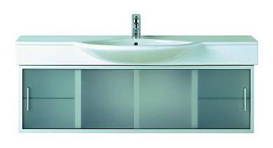 Шкаф под раковину для ванной комнаты. Две раздвижные дверцы из безопасного стекла. 2 стеклянные полки. Ширина 1500 мм. Поверхность корпуса: белая. Поверхность фасада: белая.