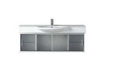 Шкаф под раковину для ванной комнаты. Две раздвижные дверцы из безопасного стекла. 2 стеклянные полки. Ширина 1500 мм. Поверхность корпуса: дуб. Поверхность фасада: белая.