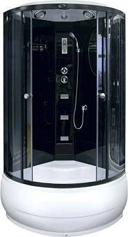 Внутренняя сборка, для монтажа в условиях ограниченного пространства! Технические характеристики и описание кабины: гидромассаж спины, 3 форсунки тропический душ душевая лейка электронный пульт управления лампа дневного света FM-радио вытяжной вентилятор полочка зеркало сиденье в поддоне черные задние стекла, 4 мм тонированные передние стекла, 4 мм черный профиль высокий поддон