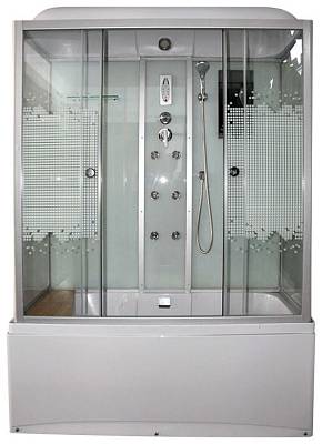 Внутренняя сборка, для монтажа в условиях ограниченного пространства! Характеристики и комплектация душевой кабины: гидромассаж, 6 форсунок тропический душ душевая лейка излив для наполнения ванны электронный пульт управления FM-радио вытяжной вентилятор верхний свет полочка зеркало шторки: прозрачное стекло с рисунком задние стенки: белое стекло высокий поддон-ванна, 55 см