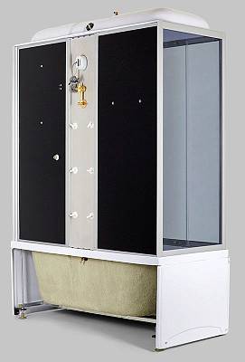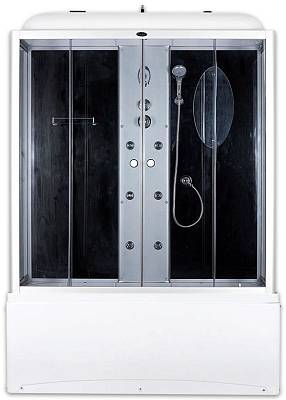 Кабина внутренней сборки, для монтажа в условиях ограниченного пространства! Технические характеристики и комплектация кабины: гидромассаж 6 форсунок тропический душ ручной душ излив для наполнения ванны смеситель электронный пульт управления радио подсветка вытяжной вентилятор зеркало полка с держателем для полотенца передние стекла: тонированные задние стекла: черные матовый профиль высокий поддон-ванна, 50 см сифон с гофрой ...