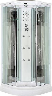 Акриловый поддон на каркасе глубина 7см, Сифон с гофрой, Центральная стойка, Пульт, Радио, Боковая подсветка, Подсветка, Принудительная вентиляция, Гидромассаж 6 форсунок, Тропический душ, Ручной душ 3-х режимный+крепление, Полка, Зеркало, Смеситель 3-х режимный