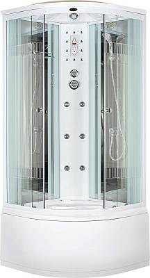 Акриловый поддон на каркасе глубина 33см, Пульт, Радио, Боковая подсветка, Подсветка Принудительная вентиляция, Гидромассаж 6 форсунок, Тропический душ, Ручной душ 3-х режимный+крепление, Полка, Зеркало, Смеситель 3-х режимный.
