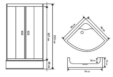 Длина 90 Ширина 90 Высота 215 Турецкая баня нет, установка не предусмотрена Форма угловая Тип поддона высокий Конструкция дверей раздвижная Количество дверей 2 Задние стенки акрил Крыша есть Профиль белый Материал поддона акрил Сидение есть Комплектация зеркало, полочка, душевая лейка Смеситель классический Высота поддона 45 Материал передних стенок стекло Толщина передних стенок 4 мм Передние стенки матовые Дополнительные функции тропический душ Модификация универсальная Гар...