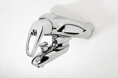 Однорычажный смеситель для ванны. Наружная установка. Монтируется на стену на два отверстия. Фиксированный излив. С эксцентриковыми соединителями, с затворами и розетками. Двухкомпонентная прочная рукоятка обеспечивает удобство использования. Встроенные опции ограничения температуры и напора воды. Поверхность: хром.