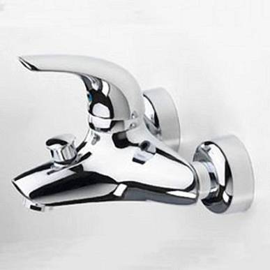 Однорычажный смеситель. На два отверстия. Монтируется на стену. Наружная установка. Фиксированный излив. Поверхность: хром.