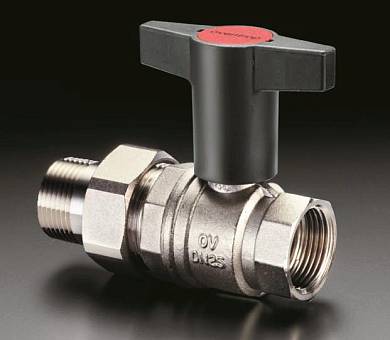 Краны шаровые «Optibal» из латуни, никелированные, полнопроходные с одной стороны внутренняя резьба, с другой стороны ниппель с наружной резьбой и накидной гайкой (коническое уплотнение) рукоятка пластмассовая, удлиненная (цвет: антрацит) с красной крышкой для маркировки трубопровод