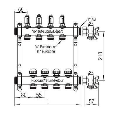 "Используется для распределения и регулирования массового расхода теплоносителя в системах обогрева. Включает в себя:- 2 распределительные трубы 1"" для подачи и отвода теплоносителя с возможностью подключения с обеих сторон.- смонтированы на звукоизолирующих оцинкованных кронштейнах- с расходомерами на подающей трубе с запорными вентилями на обратной трубе. Для подключения сервопривода М 30*1,5.- концевик коллектора с накидной гайкой 1"", уплотнительная прокладка, воздухоотводчик 3/8"" и карн для заполнения 1/2"".- два шаровых крана 1"" с накидной гайкой 1"" и уплотнительной прокладкой- набор крепежных деталей.- маркировочные таблички."