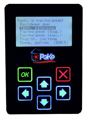 Управление электрическим котлом РЭКО осуществляется при помощи функциональной панели с ЖК-дисплеем, имеющей все необходимые индикации (информация о текущих температурах, режимах работы и неисправностях).