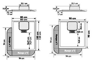 Доступен пандус в качестве опции (стандартный или угловой). Поставляется со сверхплоским сливным отверстием и съемной решеткой из нержавеющей стали.