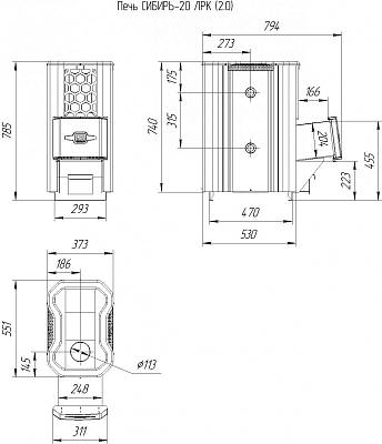 Сибирь очень мощная и эффективная. Камни в корзине каменки прогреваются с пяти сторон и дают много лёгкого пара. Выход дымохода у печи классический – смещенный к переднему краю печи. Такое расположение дымохода обеспечивает максимальный доступ к каменке.