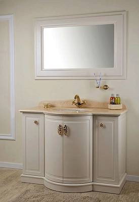 Технические характеристики и описание мебели: напольная тумба под раковину 4 распашные дверцы столешница: мрамор, крема нова мраморный плинтус керамическая раковина Roca Berna материал: МДФ крашеный цвет: 1015 Дополнительно можно приобрести: столешница: черный гранит, мрамор (цвет на выбор) зеркало, 1200х800 мм пенал, 390х445х1800 мм смеситель донный клапан