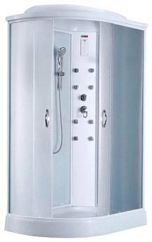 Акриловый поддон h - 15 см. Хромированный слив с сифоном. Алюминиевый профиль - БЕЛЫЙ МАТОВЫЙ. Задние стенки - стеклянные белые. Передние стекла - структурные матовые. Сенсорный пульт управления. Подсветка верхняя. FM-радио. Вентиляция. Смеситель однорычажный - четыре режима. Тропический душ. Массажная лейка. Гидромассаж спины 4+4 джет. Саморегулирующие ролики. Стеклянная полочка. Зеркало. Ручки.