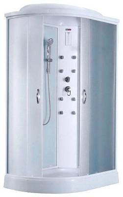 Акриловый поддон h - 15 см. Хромированный слив с сифоном. Алюминиевый профиль - БЕЛЫЙ МАТОВЫЙ. Задние стенки - стеклянные белые. Передние стекла - структурные матовые. Сенсорный пульт управления. Подсветка верхняя. FM-радио. Вентиляция. Смеситель однорычажный - четыре режима. Тропический душ. Массажная лейка. Гидромассаж спины 4+4 джет. Саморегулирующие ролики. Стеклянная полочка. Зеркало. Ручки.