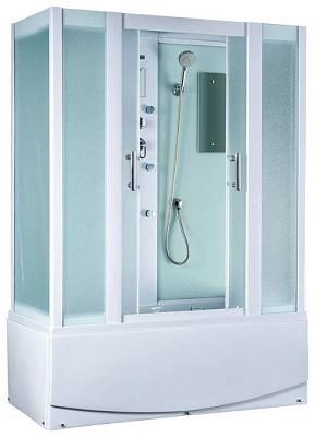 Акриловый поддон h - 52 см. Съемный экран из трех частей. Хромированный слив-перелив П/А с сифоном. Алюминиевый профиль - БЕЛЫЙ МАТОВЫЙ. Задние стенки - стеклянные белые. Передние и боковые стекла - структурные матовые. Сенсорный пульт управления. Подсветка верхняя. FM-радио. Вентиляция. Смеситель однорычажный - четыре режима. Тропический душ. Массажная лейка. Гидромассаж спины 6 джет. Наполнитель ванны. Саморегулирующие ролики. Стеклянная полочка. Зеркало. Ручки. Собирается изнутри.