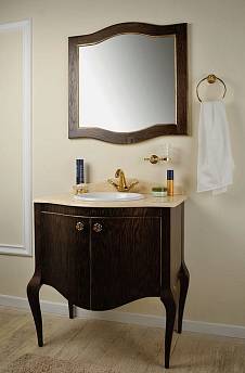 Технические характеристики и описание мебели: напольная тумба под раковину 2 распашные дверцы столешница: мрамор, крема нова мраморный плинтус керамическая раковина Roca Foro материал: МДФ, шпон дуба ножки: массив дуба цвет: 92 золото патина Дополнительно можно приобрести: столешница: черный гранит, мрамор (цвет на выбор) зеркало, 800х790 мм пенал, 465х445х1820 мм смеситель донный клапан