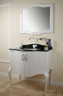 Технические характеристики и описание мебели: напольная тумба под раковину 2 распашные дверцы столешница: гранит, черный гранитный плинтус керамическая раковина Roca Berna материал: МДФ крашеный ножки: массив дуба цвет: белый Дополнительно можно приобрести: столешница: черный гранит, мрамор (цвет на выбор) зеркало, 900х790 мм пенал, 465х445х1820 мм смеситель донный клапан