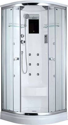 Акриловый поддон h - 15 см. с сифоном и усиленным каркасом. Акриловая армированная, монолитная задняя стенка. Анодированный, алюминиевый, хромированный профиль. Закаленное ударопрочное безопасное стекло толщиной 6 мм. Сенсорный пульт управления. Подсветка верхняя. FM-радио. Вентиляция. Смеситель однорычажный - четыре режима. Тропический душ. Лейка. Раздельный гидромассаж спины 6 джет + 6 джет. Двойные ролики. Стеклянные полочки. Зеркало. Ручки.