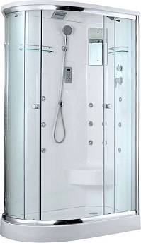 Акриловый поддон h - 15 см. с сифоном и усиленным каркасом. Акриловая армированная, монолитная задняя стенка. Анодированный, алюминиевый, хромированный профиль. Закаленное ударопрочное безопасное стекло толщиной 6 мм. Сенсорный пульт управления. Подсветка верхняя. FM-радио. Вентиляция. Смеситель однорычажный - четыре режима. Тропический душ. Лейка. Раздельный гидромассаж спины 6 джет + 6 джет. Двойные ролики. Стеклянные полочки. Зеркало. Ручки.