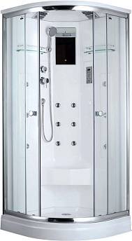 Акриловый поддон h - 15 см. с сифоном и усиленным каркасом. Акриловая армированная, монолитная задняя стенка. Анодированный, алюминиевый, хромированный профиль. Закаленное ударопрочное безопасное стекло толщиной 6 мм. Сенсорный пульт управления. Подсветка верхняя. FM-радио. Вентиляция. Смеситель однорычажный - четыре режима. Тропический душ. Лейка. Раздельный гидромассаж спины 6 джет + 6 джет. Двойные ролики. Стеклянные полочки. Зеркало. Ручки.