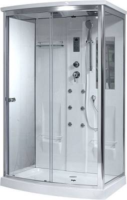 Акриловый поддон h - 15 см. с сифоном и усиленным каркасом. Акриловая армированная, монолитная задняя стенка. Анодированный, алюминиевый, хромированный профиль. Закаленное ударопрочное безопасное стекло толщиной 6 мм. Сенсорный пульт управления. Подсветка верхняя. FM-радио. Вентиляция. Смеситель однорычажный - три режима. Тропический душ. Лейка. Гидромассаж спины 6 джет. Двойные ролики. Стеклянные полочки. Зеркало. Ручки.