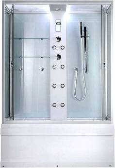 Акриловый поддон h - 60 см. Съемный экран из трех частей. Сливная система со сливом-переливом полуавтомат. Анодированная алюминиевая задняя панель и профиль (матовый хром). Закаленное ударопрочное безопасное стекло толщиной 6мм. Стеклянные задние стенки бело-серебристого оттенка. Раздвижные стеклянные двери толщиной 6 мм с откатным механизом. Металические, бесшумные роллики. Сенсорный пульт управления. FM-радио, верхняя подсветка (светодиодные ленты), вентиляция, BLUETOOTH. Од...