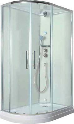Стеклянные задние стенки супербелого оттенка. Раздвижные двери толщиной 6 мм. Двойные роллики. Анодированный, алюминиевый, хромированный профиль. Фирменый термостатический смеситель Timo.